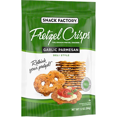Amazon [amazon.com] has 7.2-oz Snack Factory Pretzel Crisps (Garlic Parmesan) on sale for $1.94 - 10% when you 'clip' Product Page Coupon [amazon.com] - an additional 5% = $1.75 when you check out via Subscribe & Save. Shipping is free w/ Prime or on $35+.