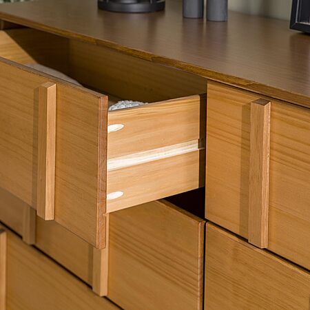 - RESPONSIBLY SOURCED MATERIALS: Crafted from solid pine wood sourced from renewable forests, ensuring eco-friendly construction. SPACIOUS STORAGE: This dresser features 6 spacious drawers, providing ample storage for clothing, linens, or accessories. SMOOTH GLIDE DRAWERS: Equipped with solid wood glides for smooth and effortless drawer operation. VERSATILE MINIMALIST DESIGN: The minimal build complements any interior style, from modern to traditional. STYLISH VERTICAL DETAILING: Vertical wood detailing on the drawers serves as contemporary drawer pulls, adding a modern touch.
