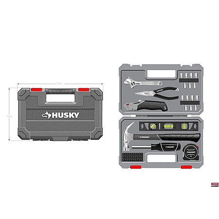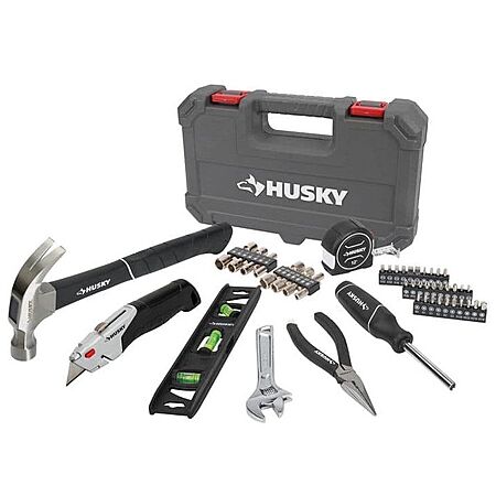 The Husky 52-piece Homeowner's Set includes a versatile assortment of tools for completing your household projects and tasks. This set includes 12 oz. Fiberglass Claw Hammer, 9-in. Torpedo Level, 6-in. Adjustable Wrench, Retractable utility knife with 1 blade, 12 ft. tape measure, 6 in High-leverage Long Nose Pliers, Magnetic Bit Driver, Utility Blades, 30 Bits, 14 Nut Driver Bits and a storage carrying case. This Husky tool set is a perfect solution in having the tools you need in a convenient carrying case.