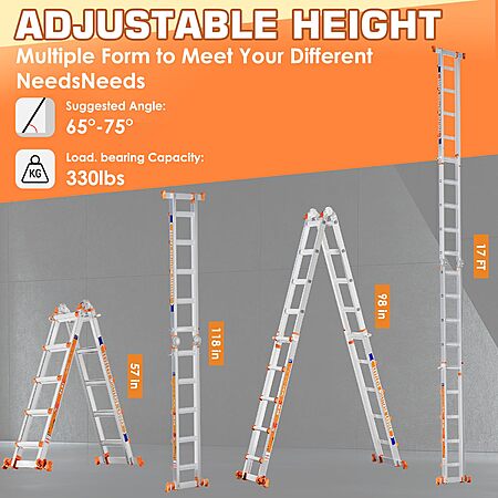 Solid deal on this LEVELEVE multi-position aluminum ladder. Gets solid reviews (4.2★ on 189 ratings, 1K+ sold this month). Built from thick 2mm industrial aluminum tubing, with anti-slip steps, stabilizer bar, and wheels for portability. Works as A-frame, extension, scaffold, or straight ladder — nice flexibility for home or outdoor projects.