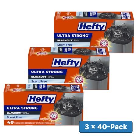 [S&S, AC] $24.81: 3 × 40-Pack 13-Gallon Hefty Ultra Strong Tall Kitchen Trash Bags ($8.27 each) + $10 credit at Amazon