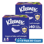 8-Pack 80-Count Kleenex Ultra Soft Facial Tissue Cube Boxes
