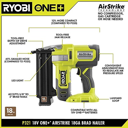 RYOBI ONE+ 18V 18-Gauge Cordless AirStrike Brad Nailer (Tool Only), $99, FS, Home Depot