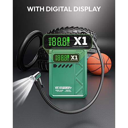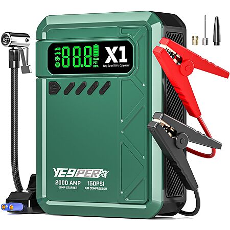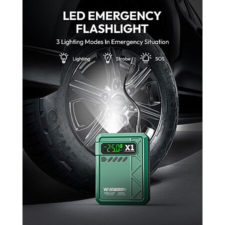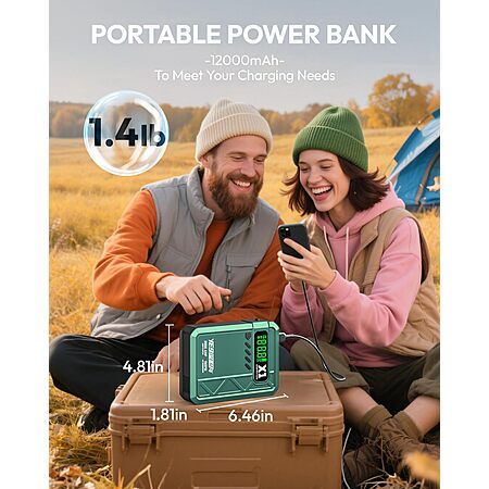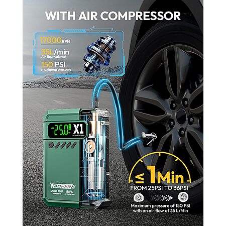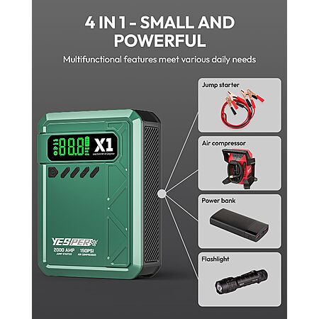 3-in-1 Emergency Tool - Combines jump starter, air compressor, and power bank in one portable device.