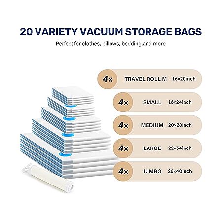 Woot! has Simple Deluxe Vacuum Storage Bags 20 Pack, Space Saver Bags with Hand Pump, Vacuum Seal Bags for Clothing Travel, Comforters, Blankets, Bedding, Pillows on sale for $9.99. Shipping is free for Amazon Prime Members (must login with your Amazon account and select a shipping address in order for Woot to apply free shipping) or is otherwise $6 per order.