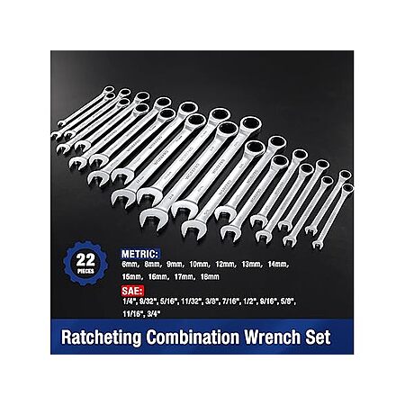 22 Pieces in Metric and SAE Size: 22 pieces metric and SAE ratchet wrench sets include 6mm, 8mm, 9mm,10mm, 12mm, 13mm, 14mm, 15mm, 16mm, 17mm, 18mm, 1/4", 9/32", 5/16", 11/32", 3/8", 7/16", 1/2", 9/16", 5/8", 11/16" and 3/4" combination wrenches, which meet most of your needs. And each wrench has clear dimensioning for quickly identifying the size you need.
