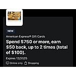 Amex Offer: Spend $750 or more, earn $50 back, up to 2 times (total of $100) expires 12/31/25