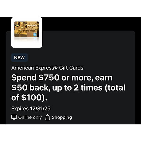 Amex Offer: Spend $750 or more, earn $50 back, up to 2 times (total of $100) expires 12/31/25