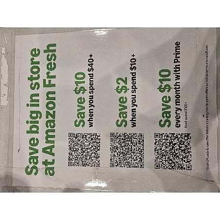 My local Amazon Fresh store has these QR codes which you can scan for some discounts.  save $10 when you spend $40 or $2 when you spend $10 (both coupons stacks)