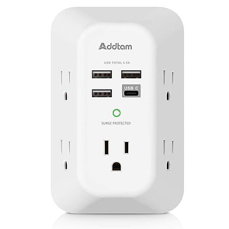 USB Wall Charger Surge Protector 5 Outlet Extender with 4 USB Charging Ports (1 USB C Outlet) 3 Sided 1800J Power Strip Multi Plug Outlets Wall Adapter ETL Listed $6.99
