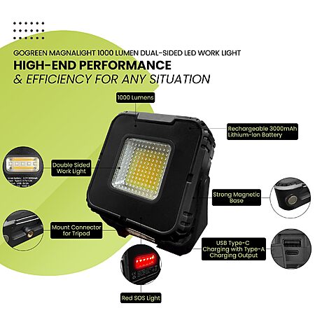 Model: Power By GoGreen Magnalight 1000 Lumen LED Work Light – Dual-Sided, Rechargeable, with Magnetic Stand & USB Charging
