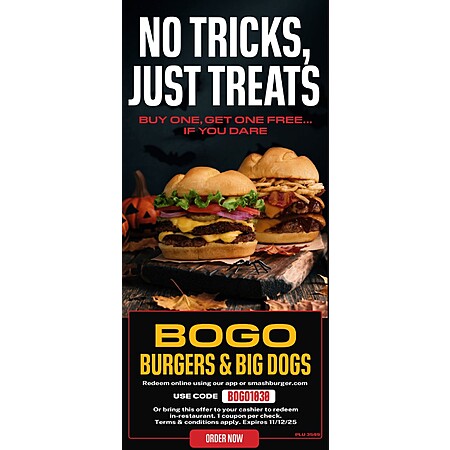 Offer valid only from 10/30/2025 through 11/12/2025 at participating Smashburger®️ retail locations in the contiguous U.S. Pricing and participation may vary. Coupon may be utilized in store or online through the smashburger.com website or Smashburger® app during regular business hours. Store hours may vary. Offer to receive one (1) complimentary burger or Big Dog (not including applicable taxes) when you purchase any burger or Big Dog. Offer only available for items of equal or lesser value. For in-store orders, must present valid coupon upon checkout to redeem offer. For online orders, must enter promo code BOGO1030 at checkout to redeem offer. Limit of one (1) offer may be redeemed per transaction. Offer not available for items with crispy chicken or brisket. Offer available for all other available protein types for burgers and Big Dogs on the menu. Discount does not apply to any applicable sales tax. Cannot be used in conjunction with any other offer, promotion, or discount. Not valid on previous purchases. No cash value (unless prohibited by law, then cash value is $.005). No substitutions. No rainchecks. Company reserves the right to withdraw or change the offer's terms and conditions at any time, at Smashburger's discretion, and without notice. While supplies last. © 2025 Smashburger IP Holder LLC. All rights reserved.