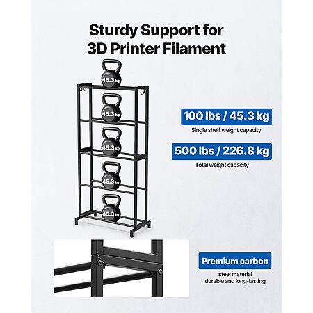 Strong Load Capacity: This filament storage rack supports 100 lbs per shelf (500 lbs total), ideal for storing 3D materials. Made from durable carbon steel, it keeps everything secure and stable, helping boost your workflow
