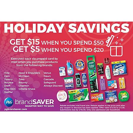 P&G Good Everyday [pgbrandsaver.com] offers the following holiday rebates: $15 Prepaid Card on $50 Spend or $5 Prepaid Card on $20 Spend on Qualifying Products.