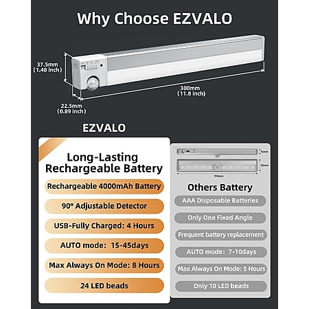 - Detects movement within 13 ft/120° and automatically turns on, shutting off after 20 seconds.