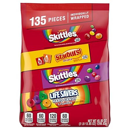 Model: Skittles, Starburst and Life Savers Fun Size Fruity Candy Assortment, 45.85 oz Bag, 135 Pieces