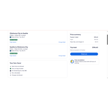 Alaska Airlines and Expedia have round trip airfares travelling to and from Oklahoma City (OKC) and Seattle (SEA) for $197, nonstop.  These are basic economy fares that allow a personal item and a carry-on bag.  There is no seat selection and no change.  If you are travelling with children, you will be seated together as per Alaska's policy.