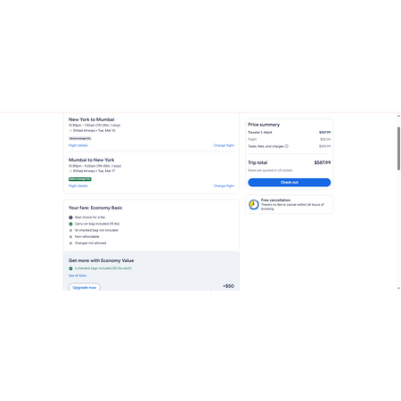 Skytrax rated 4-star Etihad Airways via Expedia have round trip airfares travelling from New York (JFK) to Mumbai India (BOM) for $588, making 1 stop in Abu Dhabi UAE both ways for 2-21 hours, so plan ahead.  Stopover duration depends on the flights you choose.  This is a basic economy fare that only allow a personal item and a carry-on bag.  As you can see in the screenshot below (at the bottom of the image), you have an option to pay an additional $50 round trip for 2 checked bags.
