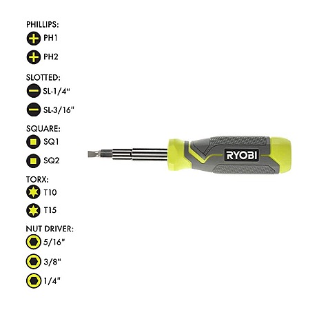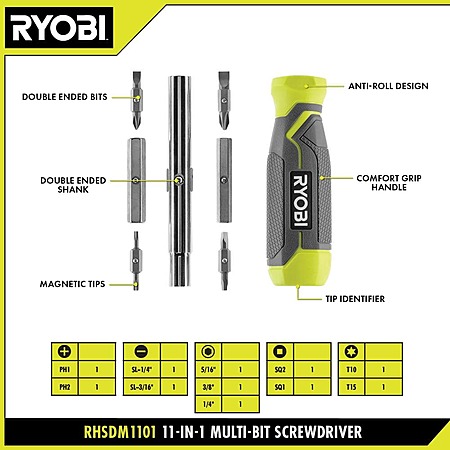 The RYOBI 11-in-1 Multi-Bit Screwdriver is designed with some the most common bits and nut drivers needed. The magnetic tip hold increases fastener retention. The tip identifier and anti-roll design aid in easy identification and keeping the screwdriver in place. Included is (1) Handle, (1) PH1, (1) PH2, (1) SL-1/4 in., (1) SL-3/16, (1) SQ1, (1) SQ2, (1) T10, (1) T15, (1) HEX 5/16 in., (1) HEX 3/8 in., (1) HEX 1/4 in.