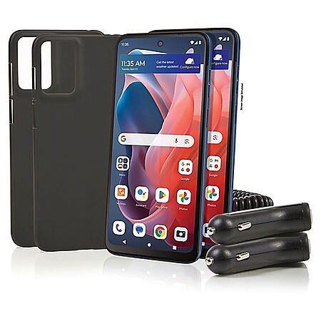 Includes two Moto G Play 2024 4G smartphones, each with USB charging cable, SIM tool, one year of service/1,500 minutes/1,500 texts/1.5GB data; handset, car charger, wall charger, case, and voucher