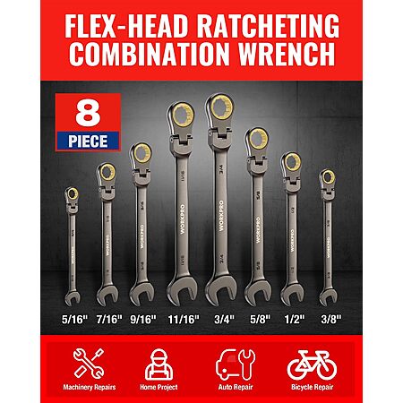 8-Piece WORKPRO SAE Flex-Head Ratcheting Combination Wrench Set $21 + Free S/H