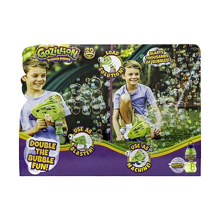 - Blasts Thousands of Bubbles: Unleash a whirlwind of bubbly excitement with the 2-in-1 Gazillion Double Bubble Blaster! Reconfigure the handles to use as either a handheld bubble wand or a bubble machine.