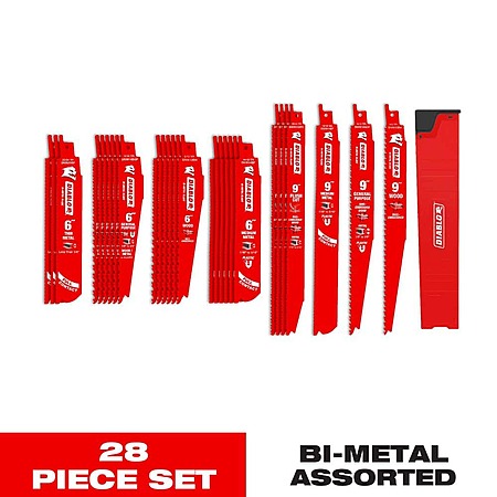 Includes: six 6 in. 6/12 TPI nail-embedded wood blades, six 6 in. 14/18 TPI metal cutting (3/32 in. to 5/16 in.) blades, six 6 in. 8/14 TPI general purpose/nail-embedded wood and metal (1/8 in. to 1/2 in.) blades, three 6 in. 20/24 TPI metal cutting (1/8 in. or less) blades, four 9 in. 10/14 TPI flush cut blades, one 9 in. 6/12 TPI nail-embedded wood blade, one 9 in. 14/18 TPI metal cutting (3/32 in. to 5/16 in.) blade and one 9 in. 8/14 TPI general purpose/nail-embedded wood and metal (1/8 in. to 1/2 in.) blade