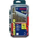 BOSCH cobalt drill bit set - 21 pcs. Sizes from 1/16" to 1/2". Split points on bits 1/8 In. and larger to reduce skating when starting. 8% cobalt alloy - good for drilling hard metal.