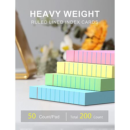 • 【Clean Single-Side Lining】Ruled 3 x 5 index cards are narrow ruled 7mm spacing ensures neat handwriting for all ages. Ruled on one side for easy note taking. Reverse blank side allows quick sketches or diagrams. 200-count pack of 3x5 index cards, includes 4 assorted colors, 50 count of each color