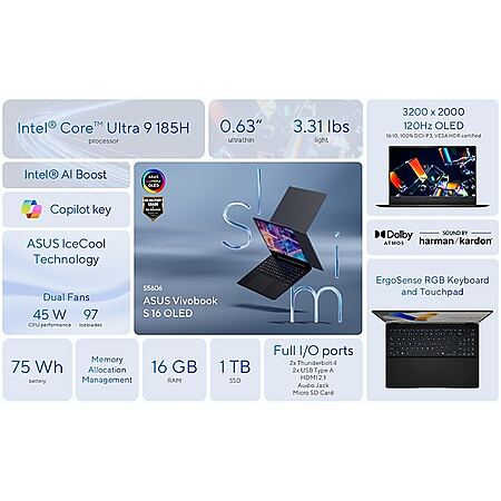 ASUS VivoBook S 16: 16" 2.8K OLED 120Hz, Intel Core Ultra 9 285H, 16GB LPDDR5, 1TB SSD $799.99
