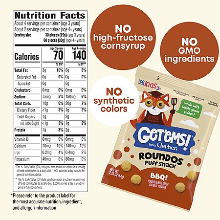 - ALL AROUND, WELL-ROUNDED YUMMY GOODNESS: Enriched with calcium and made with real whole grain quinoa, our Get'ems! from Gerber BBQ Roundos Puffs Snacks offer wholesome, tasty nutrition in every munch