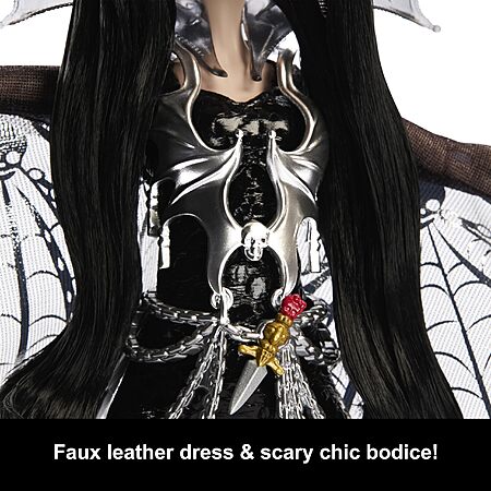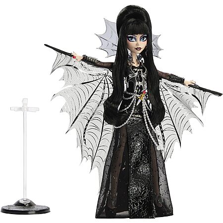 $44.99*:Monster High Doll, Elvira, Mistress of The Dark Collectible in Black Faux Leather Dress with Silvery Batwing Cape and Premium Accessories (Amazon Exclusive)