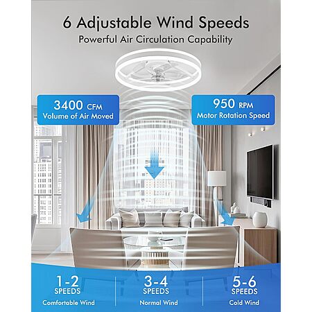 - Ultra-Quiet DC Motor: Equipped with a high-efficiency DC motor, this fan delivers exceptional airflow, achieving 3400 CFM and reaching speeds of up to 950 RPM. The minimum noise level during operation is about 24 dB. The reversible motor ensures optimal air circulation, providing a cooling breeze in summer and warm air circulation in winter, along with a natural wind mode for enhanced comfort