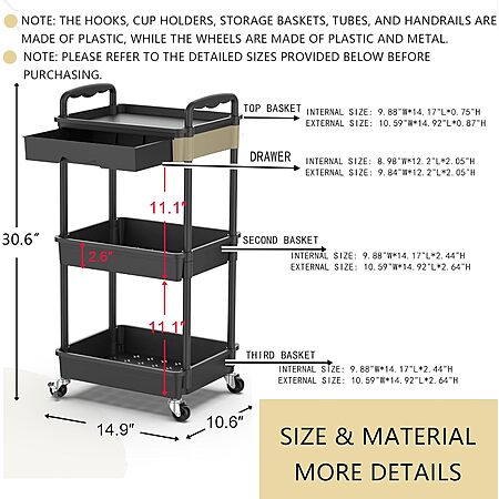 Prime Members: Goovilla 3-Tier Rolling Utility Cart (Black) $12.99 + Free Shipping w/ Prime or on $35+