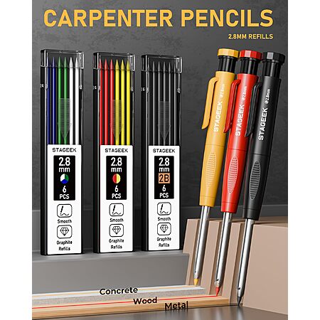 STAGEEK via Amazon [amazon.com] has 22-Pack STAGEEK Mechanical Carpenter Pencil Set w/ Sharpener, 60 Refills & Storage Pouch on sale for $23.99 - 30% off when you enter the coupon code NLJVPRNF =$16.79. Shipping is free w/ Prime or on $35+.