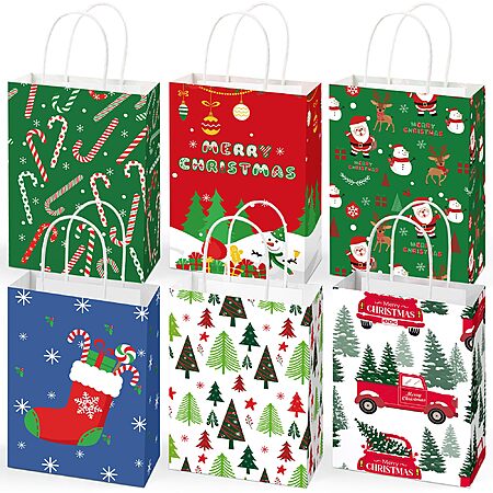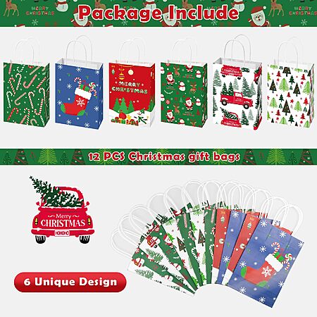 - [Festive Variety with Unique Designs]:Enhance your gifting experience with our Christmas gift bags, featuring 6 charming designs including Santa, reindeer, and snowflakes. Each set includes 12 bags, perfect for adding a splash of holiday spirit to every present.