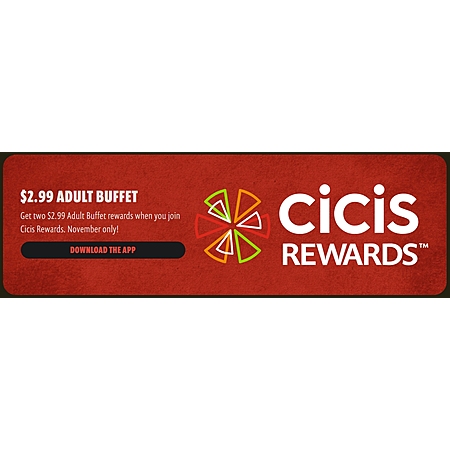 Get two $2.99 Adult Buffet rewards when you join Cicis Rewards. November only!
