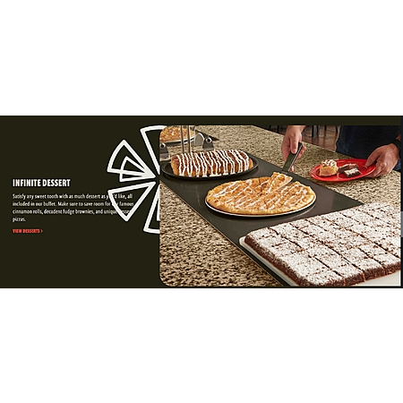 Buffet includes salad bar, pasta bar, deserts, and pizza. For those unaware you can ask them to make almost any variation of pizza and they will do so at no additional cost. Just gotta be quick to get some slices when they take it out of the oven and add it to the buffet!