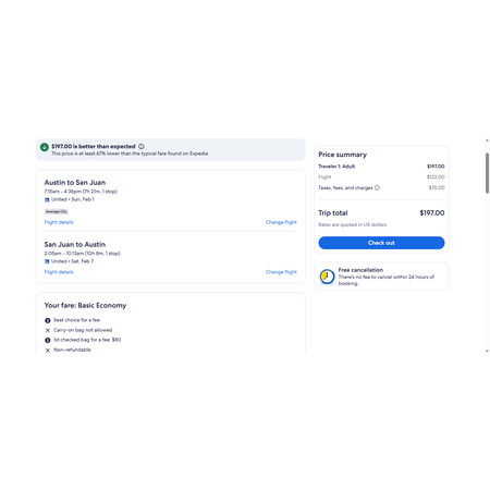 Delta, United and Southwest Airlines have round trip airfares travelling to and from Austin TX (AUS) and San Juan Puerto Rico (SJU) for $197, making 1 stop both ways. These are basic economy fares. On Delta and Southwest you may have a personal item and a carry-on bag. On United you may only have a personal item. There is no seat selection and no change.