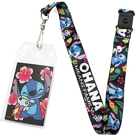 Model: Disney Lanyard, Badge Holder Charm, Ohana Means Family Stitch Scrump Poses Tropical Flora Black, Elastic