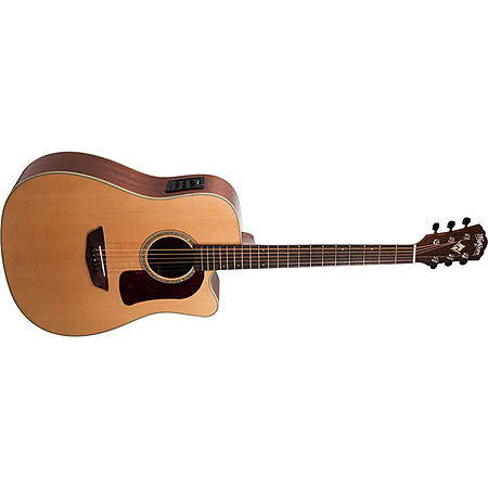 A Cutaway-Electric version of Washburn's Heritage Series all solid wood D100S Dreadnought. The D100SWCE is upgraded with a Fishman Presys Blend preamp and under saddle transducer with a microphone blend. A solid Torrefied Sitka Spruce soundboard paired with solid mahogany back and sides provides for an aged voice that harkens back to the prewar golden era of acoustic guitar building.