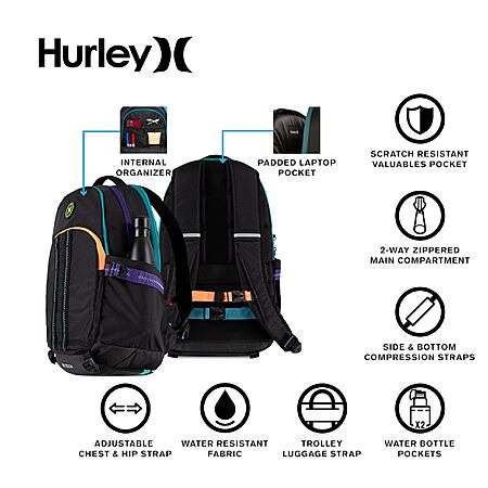 - Distinctive Branding: Embrace the Hurley spirit with the diamond jacquard webbing attachment system at the front pocket and the signature branding featuring a silicone logo patch and "H-Tech" on the bottom panel.