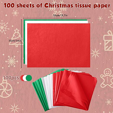 - Christmas Tissue Paper set comes with 100 sheets in total, including red, green, and white ones. Each sheet measures 50cm x 35cm (about 19.7in x 14in), providing ample tissue paper bulk for various uses.