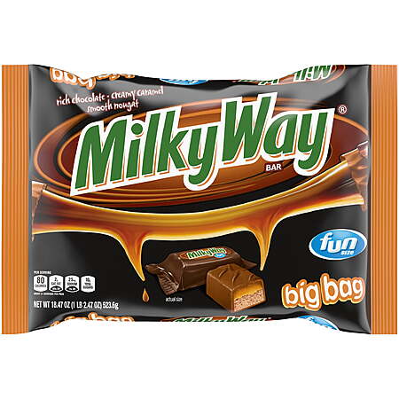 For a deliciously distracting, bite-sized chocolate and caramel treat, look no further than MILKY WAY. Perfect for snacking and sharing at home or on-the-go, or incorporated into your favorite dessert recipes, MILKY WAY Fun Size Bars are the same brand you love with creamy caramel, smooth nougat and rich milk chocolate, but in a deliciously distracting smaller portion. So Many Ways to Savor. At home or in the office, your candy dish will be a hit with MILKY WAY Fun Size Snack and share at home or on-the-go, or incorporate MILKY WAY Fun Size into your favorite dessert recipes. Give the gift of MILKY WAY to the chocolate lover in your life. This bulk amount of delicious, assorted chocolate candy is your one-stop-shop for Halloween candy! Best of all, individually wrapped bulk candy means everyone stays safe from germs and your candy stays fresh longer! If you DO end up with leftovers, connect with us for some deliciously inspiring recipes! Contains one 18.47-ounce bag of MILKY WAY Spooky Fun Size Chocolate Halloween Candy Made with caramel, creamy nougat and real milk chocolate Use these tasty bites of caramel chocolate candy to pass out to trick-or-treaters on Halloween Each individually-wrapped piece of MILKY WAY Fun Size Chocolate has a fun, fall-themed wrapper to dress up your candy bowl Ghost all out during Halloween movie marathons with distractingly delicious MILKY WAY Halloween candy Feature Benefits not yet available. Coming Soon!