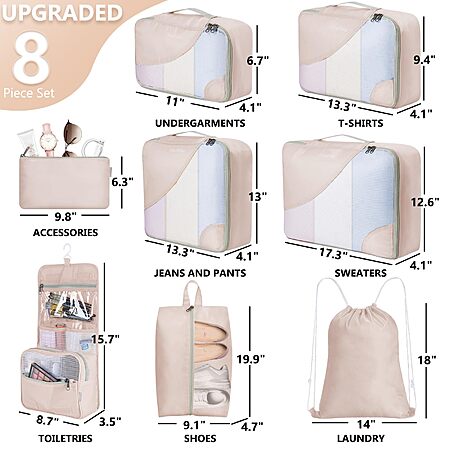 $12.99 8 Piece Set with Packing Cubes,Toiletry Bag, Shoe Bag and Laundry Bag in Cream Amazon