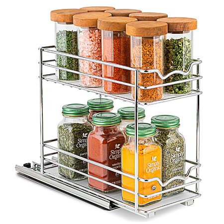 Holdandstorage via Amazon [amazon.com] has 4"W x 10-3/8"D x 8-7/8"H Holdn' Storage Double Pull Out Spice Rack Cabinet Organizer for $9.99. Shipping is free w/ Prime or on $35+.