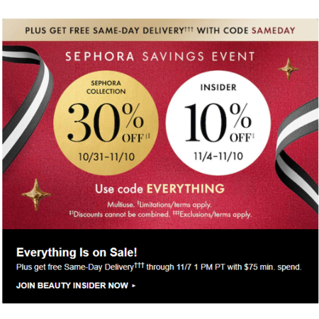Sephora Savings Event, 30% off Sephora Collection 10/31-11/10, 10% Off Insider 11/4-11/10, Use Code EVERYTHING