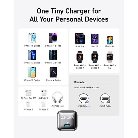 Model: USB C Charger Block 20W, Anker 511 Charger (Nano Pro), PIQ 3.0 Compact Fast Charger for iPhone 15/15 Plus/15 Pro/15 Pro Max, 14/13/12 Series, Galaxy, Pixel 4/3, iPad (Cable Not Included)