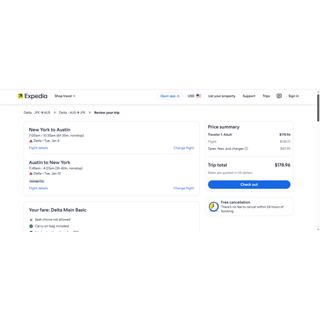 Delta Air Lines and Expedia have round trip airfares travelling to and from New York (JFK) and Austin TX (AUS) for $179, nonstop. These are basic economy fares that allow a personal item and a carry-on bag. There is no seat selection and no change.