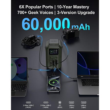 - Capacity & Output: 60,000mAh (192Wh); 200W total output; 140W dual fast charging.